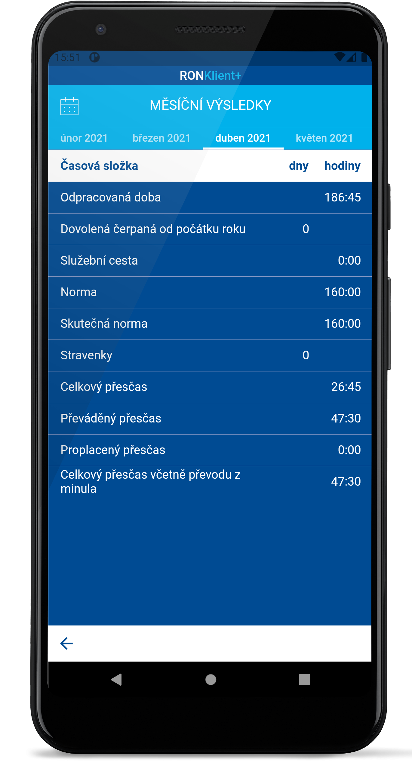 - Okamžitý přístup k denním i měsíčním výsledkům docházky.