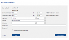 Je možné editovat jednotlivé intervaly docházky nebo celý den najednou. Samozřejmostí je možnost vložení převáděného nebo proplaceného přesčasu případně zadání prémií nebo jiných odměn. Vložená docházková data lze schválit třemi úrovněmi, dle definovaných práv.