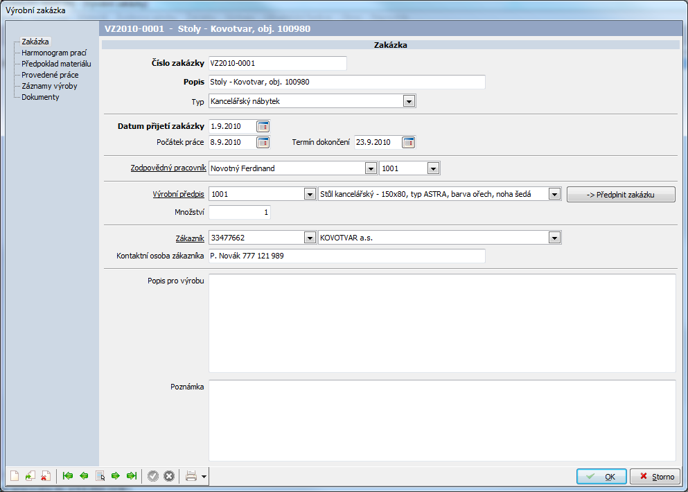 Zakázkový systém slouží k evidenci výrobních zakázek, sběru dat z výroby a evidenci pracovních výkonů. Ve spolupráci s fakturačním a skladovým systémem umožňuje přehled o plnění jednotlivých objednávek, evidenci skladu materiálu a po ukončení naskladnění hotových výrobků, expedici a fakturaci.